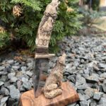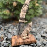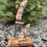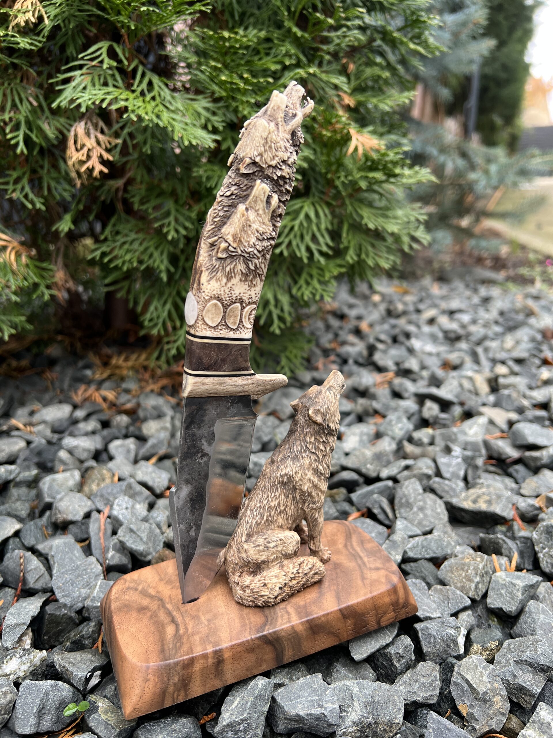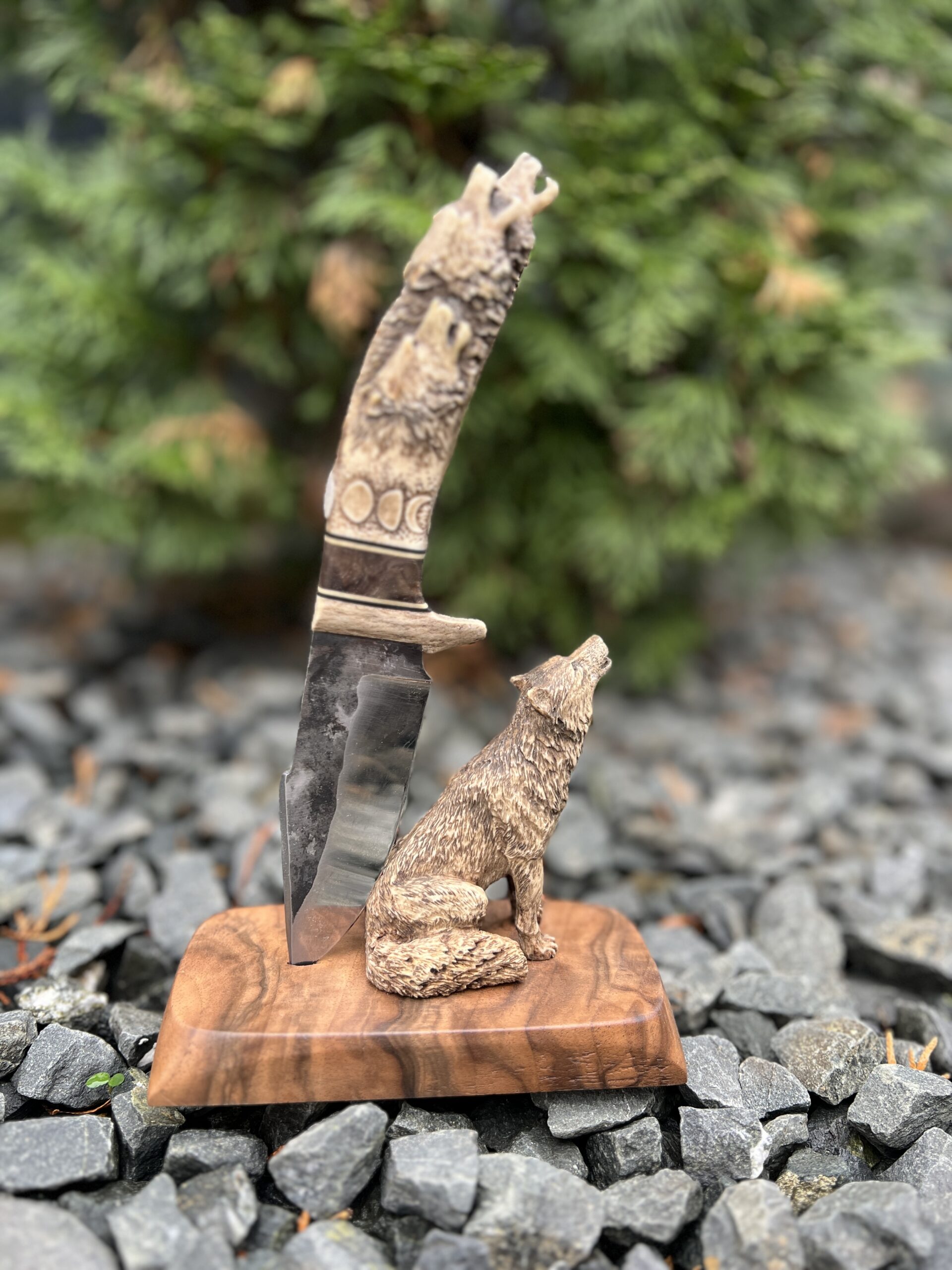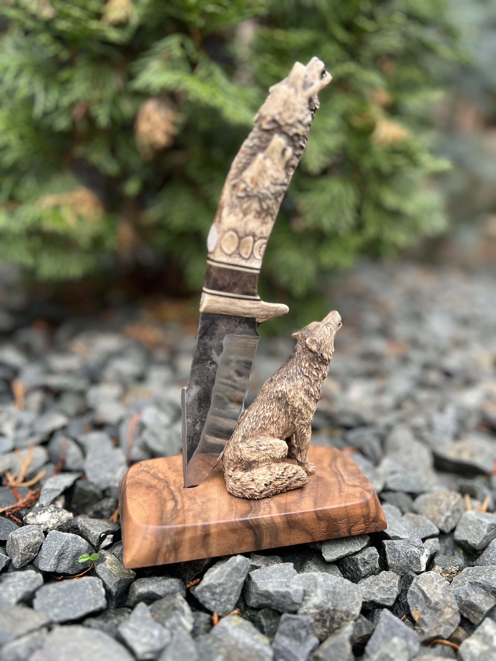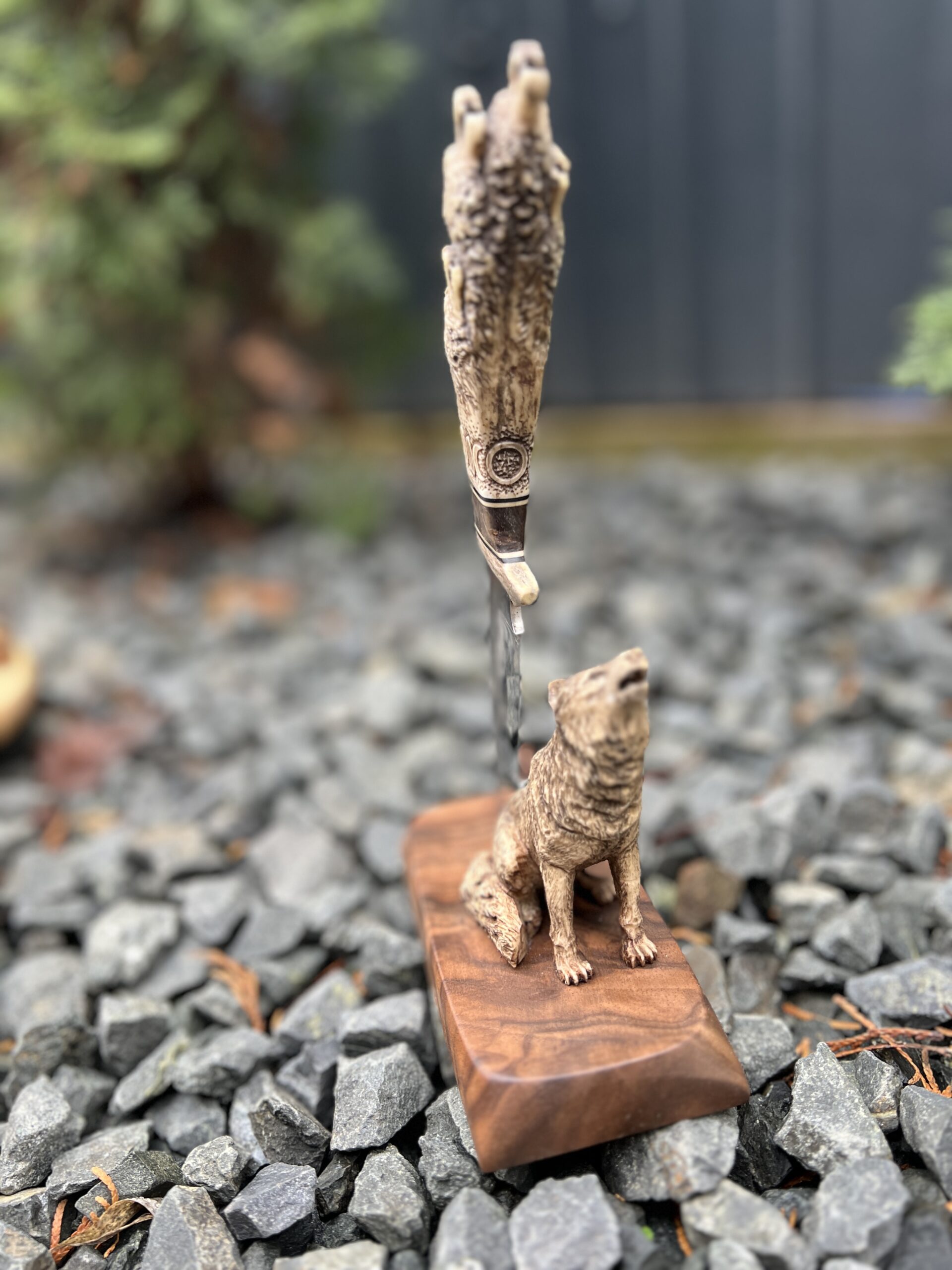 One-of-a-kind art knife with sculpted elk antler handle and walnut display stand.
