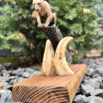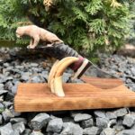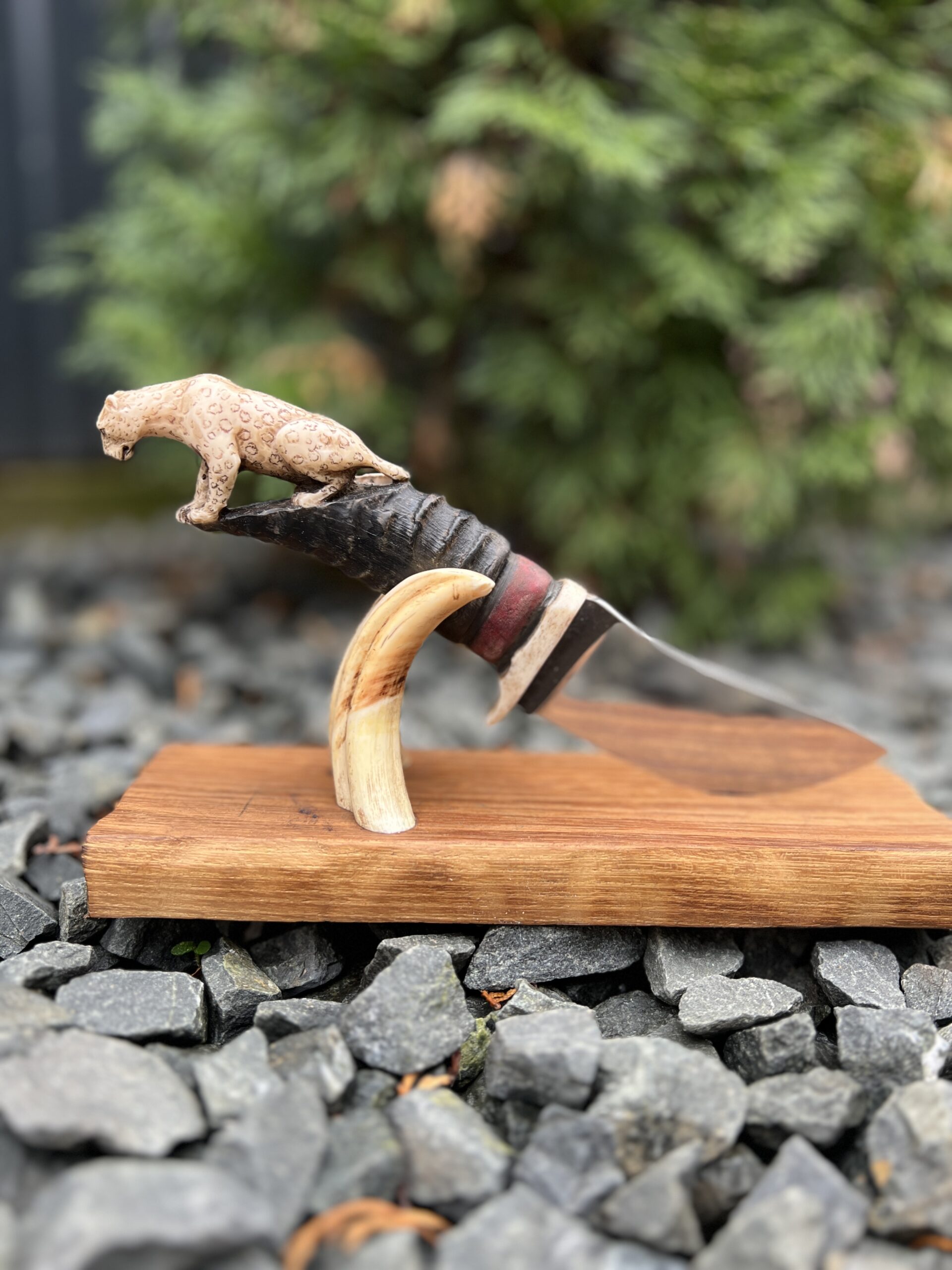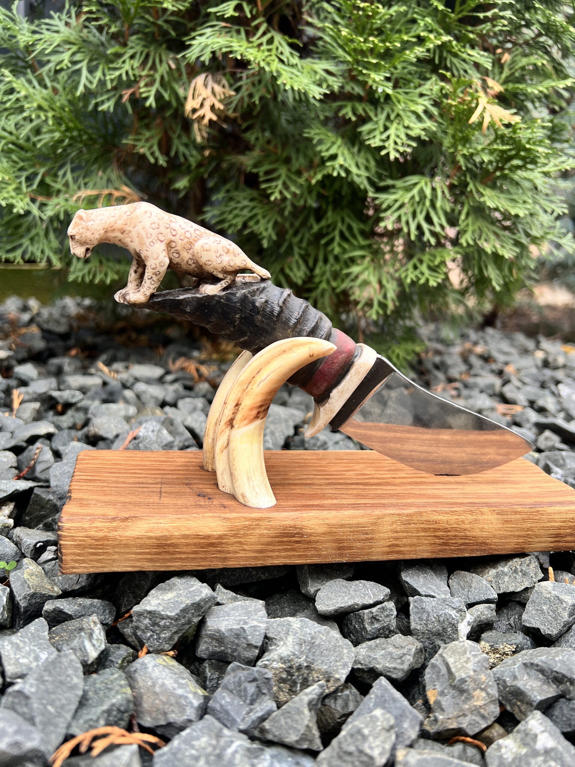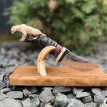 Hand-carved knife with antelope handle and sculptural oak stand.