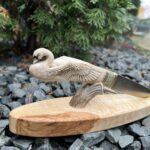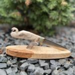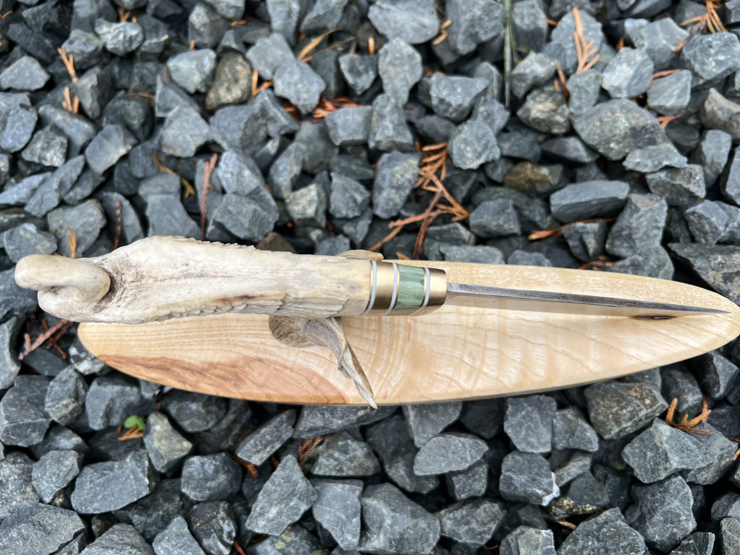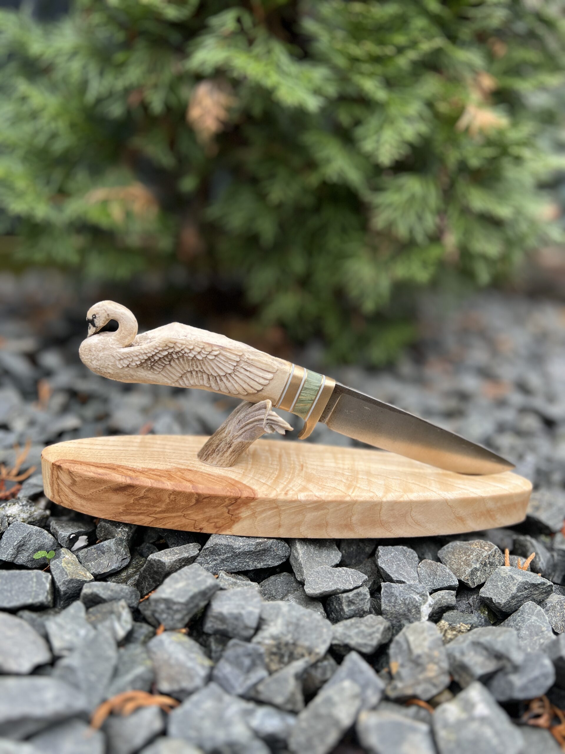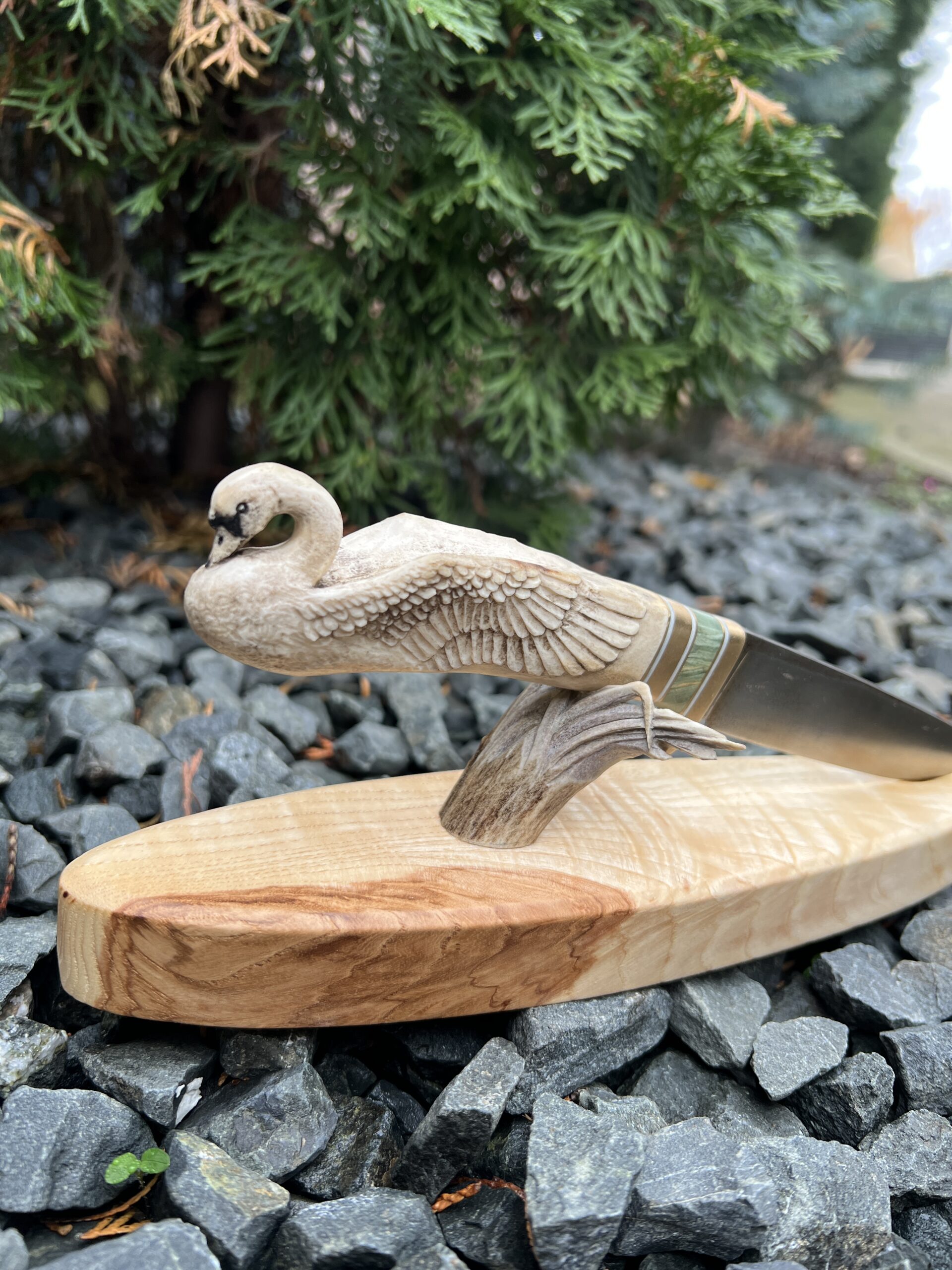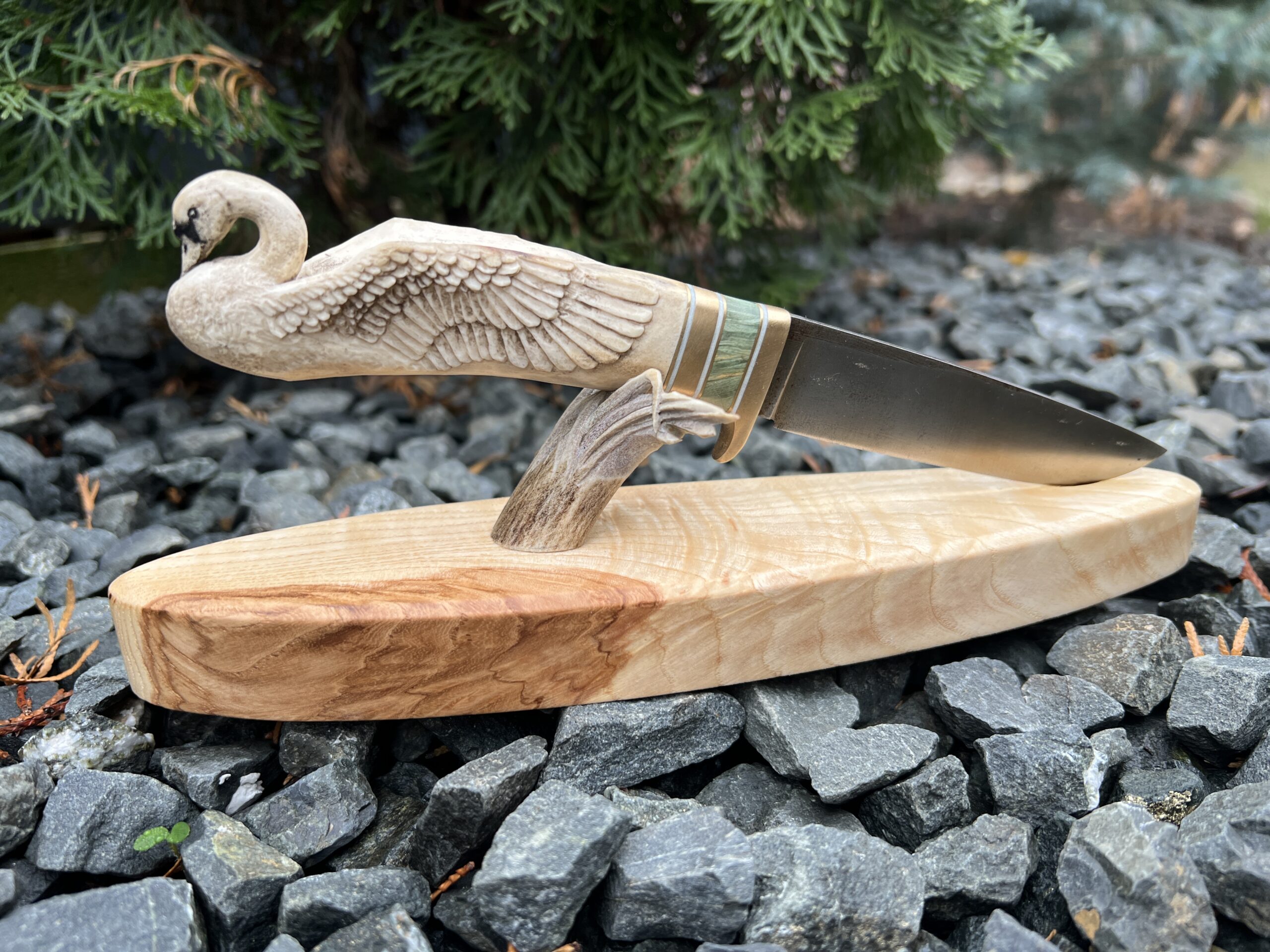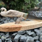 Hand-carved knife with deer antler handle and sculptural wooden stand.